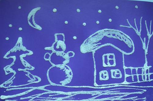 На основе синего или другого холодного цвета нарисуйте любую зимнюю сцену. Это может быть дом, покрытый снегом, снеговик или ёлка. Если ребёнок не справляется с рисунком, не стесняйтесь помочь ему.
