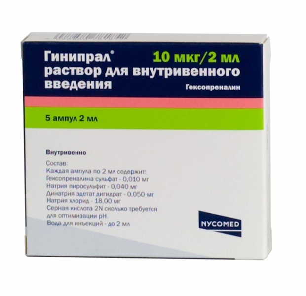 Раствор для инфузий «Гинипрал» содержит активное вещество гексопреналин сульфата, которое эффективно подавляет схватки. При введении этого препарата необходимо контролировать частоту сердечных сокращений и артериальное давление, а также проводить кардиомониторинг плода.