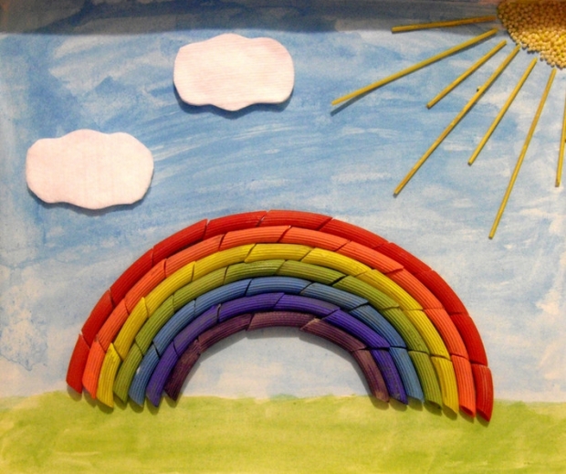- После высыхания клея покрасьте макароны в яркие цвета или оставьте их в натуральном виде для создания эффекта «натуральности».