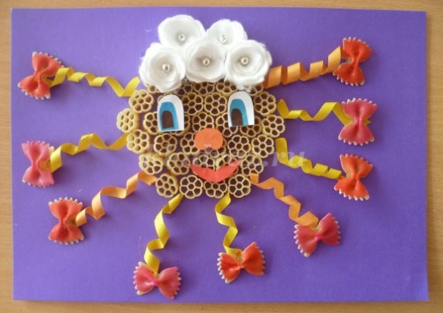 Можно создать панно, используя макароны. Для этого также понадобятся половинки гороха, рис и гречневая крупа. Сначала маркером рисуем эскиз солнца с лучами. Затем приклеиваем макароны с помощью клея ПВА. Из половинок гороха формируем само солнце, а гречневой крупой создаем глаза. Лучи солнца можно сделать из спиралек. Рядом, используя рис, можно изобразить облако. Для домика выкладываем крупные спиральки. После завершения работы отдельные элементы композиции раскрашиваем гуашью разных оттенков, чтобы сделать картину более яркой и выразительной.