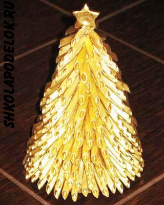Сначала нужно подготовить основу для вашей елочки. Для этого возьмите ножки от стаканов и обклейте их макаронами в форме бантиков. Наклеивать следует строго вертикально. По мере поднятия к верхушке, приклеивайте половинки бантиков, чтобы добиться эффекта сужения. Затем соедините две ножки между собой, располагая широкие части наружу. После этого приклейте ножки к елочке и покрасьте её в зеленый цвет. Завершите оформление, приклеив золотистые звездочки на елочку.