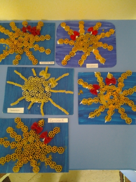 После этого приклеить выбранные по цвету и форме макароны на нужные места.