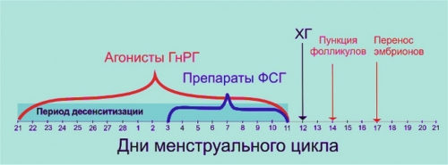 Активизацию работы яичников осуществляют на 3-5 день менструального цикла. В этот период вводят гормональные препараты, которые способствуют усилению функции данного парного органа. Длительность этого этапа составляет от 10 до 14 дней. Учитывая значительное количество используемых гормональных средств, длинный протокол может привести к развитию синдрома гиперстимуляции яичников. Этот синдром проявляется множеством симптомов, среди которых маточное кровотечение, нарушения в работе пищеварительной системы, понижение артериального давления и затрудненное дыхание.