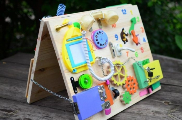 Во-первых, для изготовления лучше выбирать натуральное дерево в качестве основного материала. Во-вторых, если вы планируете сделать доску для малыша старше года, для его безопасности бизиборд рекомендуется надежно закрепить на стене.