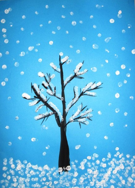 Чтобы привлечь внимание юного художника, начните с загадок, песен и стихов о зиме, снегопаде и снежинках. Для создания нужной атмосферы можно включить новогодние мелодии, но на тихом уровне. Попросите ребенка изобразить белый снег на синем листе бумаги. Для этого достаточно сделать несколько мазков белой краской. Результат будет впечатляющим – белый снег на синем фоне выглядит очень красиво. Затем предложите ему повторить небольшие мазки в разных частях листа, чтобы создать эффект «падающего снега».
