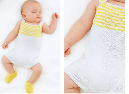 Лёгкий комбинезон для новорожденной девочки на бретелях отличается удобством и привлекательным внешним видом. Эта модель идеально подходит для малышей в возрасте от 0 до 12 месяцев. Для её создания потребуется 1 (2) 2 (3) мотка белой пряжи (93% акрила, 7% эластана), 1 моток жёлтых ниток, спицы №3 и 3.5, крючок №3, 5 кнопок диаметром 9 мм и 2 жёлтые пуговицы диаметром 15 мм.