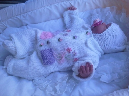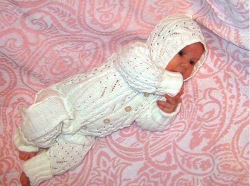 Такой комбинезон станет отличным выбором для выписки, благодаря своему красивому узору и мягкой белой пряже.