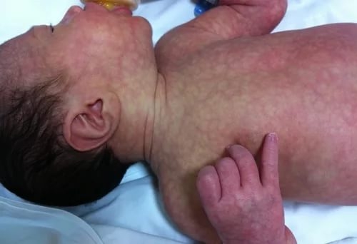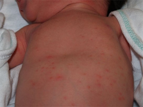 Почти половина новорожденных сталкивается с токсической эритемой, которая обычно проявляется на третьи сутки жизни. Причины ее появления до конца не выяснены, однако предполагается, что это может быть результатом чрезмерной реакции иммунной системы. Также на развитие эритемы может влиять рацион матери, содержащий сильные аллергены, такие как шоколад и цитрусовые.