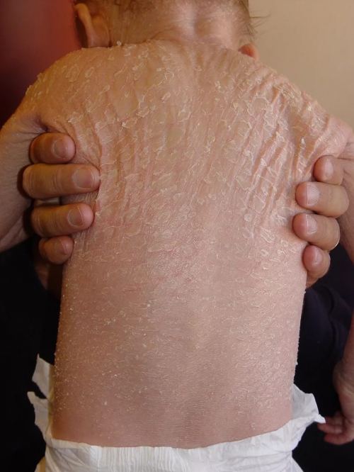 | Шелушение | Физиологическое шелушение (особенно на ладонях и стопах) после рождения | Выраженное, крупнопластинчатое шелушение, сопровождающееся покраснением или трещинами |