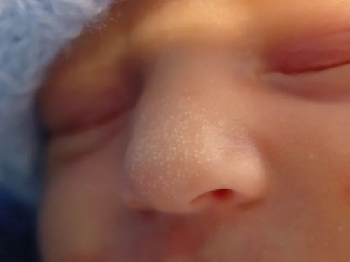 Эти образования представляют собой небольшие кисты, формирующиеся из сальных желез. Они возникают у более чем 50% новорожденных сразу после рождения и имеют белый оттенок. Размеры таких образований невелики, а их распространение наблюдается на лбу, носу и щеках. У детей, появившихся на свет раньше срока, папулы могут также возникать на руках, ногах или туловище.