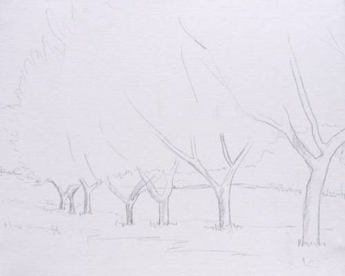 • Ребенок может начать с набросков деревьев и травы, как показано на фото выше. Также можно воспользоваться готовым шаблоном.