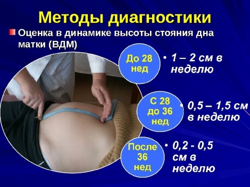 С 20 недели высота дна матки соответствует сроку беременности, то есть на 20 неделе она составляет 20 см. Считается, что при нормальном течении беременности еженедельный рост матки должен составлять около 1 см. Допустимые колебания не должны превышать 3 см в ту или иную сторону, иначе это может указывать на патологию.