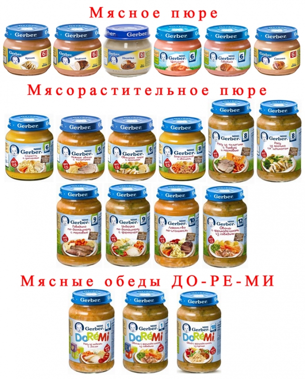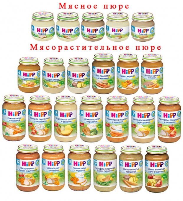 • мясорастительное пюре (содержит мясо, овощи, бульон, крупу или макароны). Рекомендуется для детей старше 8 месяцев;