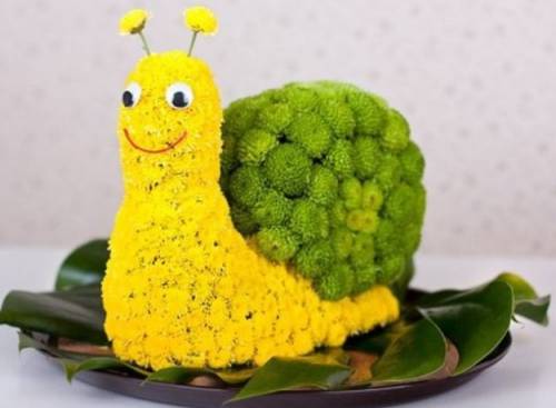 • Начните с нижней части домика улитки, укладывая хризантемы зеленого цвета. Вторую часть украсьте желтыми цветами (от верха головы). Располагайте цветы плотно друг к другу, чтобы скрыть основу.