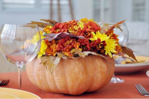 Поделка из тыквы и цветов выглядит очень эффектно и делается легко: