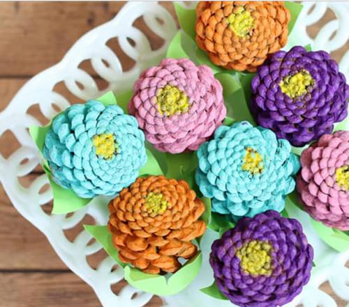 Для изготовления поделки из шишек вам понадобятся шишки, акриловые краски, кисти и двусторонний цветной картон. В центре шишки нарисуйте желтую точку, а остальную часть закрасьте основным цветом. Сделайте несколько цветов разных оттенков. После высыхания прикрепите к ним вырезанные лепестки с помощью двустороннего скотча. Затем установите их на основу. При желании композицию можно дополнить живыми цветами.