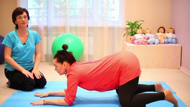 Чтобы восстановить силы перед следующей схваткой, можно опуститься на колени, опираясь головой и грудью на фитбол. Это положение уменьшает нагрузку на поясницу и позволяет немного отдохнуть.