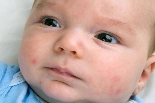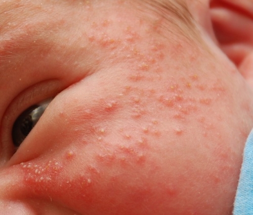 Прыщи у новорожденных на щеках и подбородке могут появляться из-за аллергической реакции на определенные продукты. Эти шелушащиеся высыпания, имеющие розоватый или красный оттенок, напоминают ожоги от крапивы. Сыпь может также проявляться на руках, животе и спине. При сильной интоксикации и постоянном контакте с аллергеном прыщи могут трансформироваться в коросты и начать мокнуть.