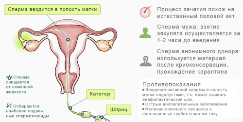 Пациентка проходит медицинское обследование и подготовку. С помощью УЗИ и других исследований врач определяет наиболее удачный период для зачатия. В назначенный день подготовленная сперма вводится в полость матки через катетер. Дальше все зависит от природы: сперматозоиды встречаются с яйцеклеткой, и происходит оплодотворение. Процедуру можно повторять до четырех раз в течение одного менструального цикла.