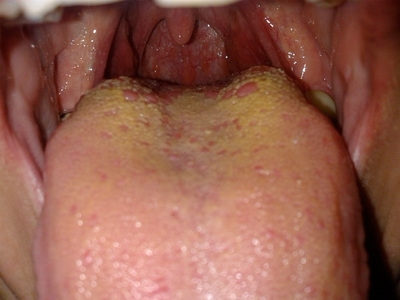 белый налет охватывает не только язык, но и щеки с деснами, и не исчезает в течение всего дня;